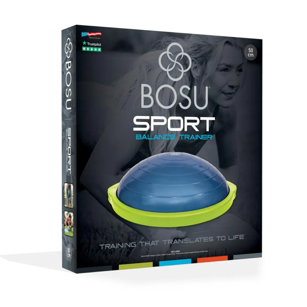 – Træning af din coremuskulatur BOSU Sport er blå med grøn bund.