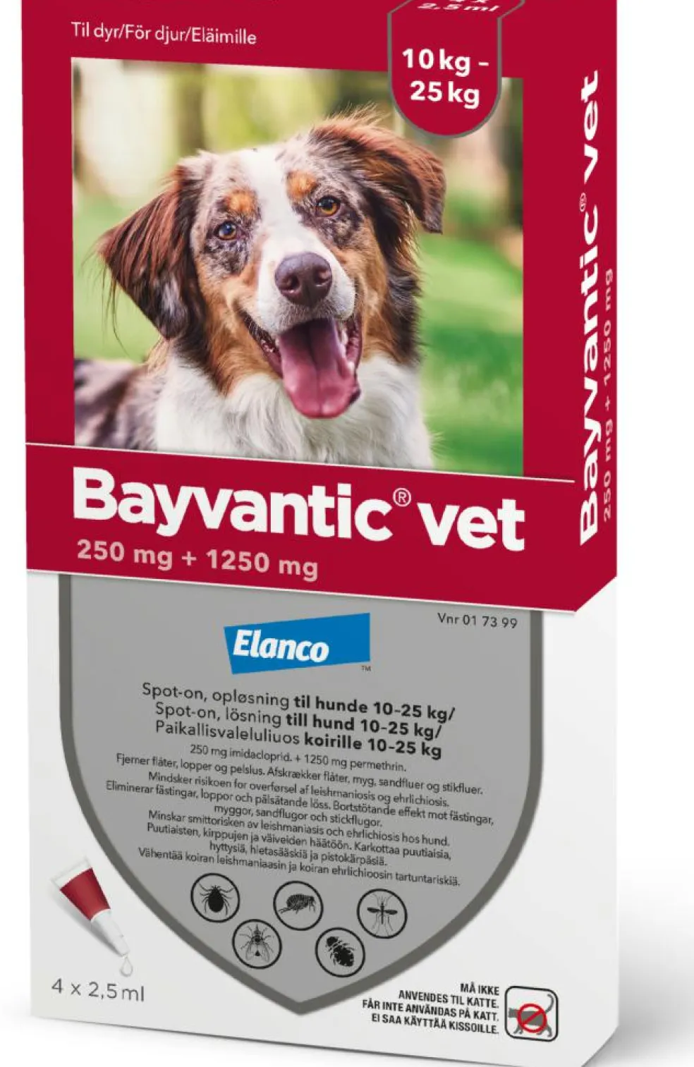 Minimum text – Enduser – Denmark Bayvantic® vet. spot-on, opløsning til hund. 1 ml indeholder 100 mg imidacloprid og 500 mg permethrin. Indikationer: Til behandling og forebyggelse af loppeangreb i 4 uger. Præparatet kan anvendes som en del af behandlings-strategien ved loppebetinget allergisk dermatit. Til behandling af pelslus. Præparatet har en vedvarende acaricid og repellerende (”antiblodsugende”) virkning mod visse flåtangreb i op til 4 uger. Reducerer sandsynligheden for ehrlichiosis fra dag 3 efter behandling og op til 4 uger. Det anbefales at fjerne flåter, inden behandling foretages. En behandling har repellerende virkning på sandfluer i op til 3 uger, på myg i op til 4 uger og på almindelige stikfluer i 4 uger. Reducerer risikoen for infektion med leishmania infantum fra sandfluer i op til 3 uger. Det er en indirekte effekt, der skyldes produktets virkning på sandfluen (vektoren).Kontraindikationer: Må ikke anvendes til katte. Hvalpe under 7 uger og 1,5 kg bør ikke behandles. Bør ikke anvendes i tilfælde af overfølsomhed over for de aktive stoffer eller et eller flere af hjælpestofferne. Advarsler og forsigtighedsregler: Må ikke anvendes til katte, da det er særdeles giftigt for dem. Katte må ikke slikke på den behandlede hunds påføringssted. Søg straks dyrlæge. Tillad ikke nyligt behandlede hunde at slikke på hinanden. Undgå at pipettens indhold kommer i kontakt med øjne eller mund på hunden. Hunde der behandles for at reducere risikoen for infektion med Leishmania infantum via sandfluer, bør holdes i et beskyttet miljø de første 24 timer efter første dosis er påført. Rådfør med dyrlægen før syge og svækkede hunde behandles. Behandlede dyr bør omgås med forsigtighed indtil påføringsstedet er tørt. Nyligt behandlede dyr bør ikke gives lov til at sove sammen med deres ejere/husets børn. Indtag ikke præparatet. Vask hænderne grundigt efter brug. Præparatet er skadeligt for organismer i vandet og behandlede dyr bør ikke komme i kontakt med overfladevand de første 48 timer. Opløsningsmidlet i Bayvantic kan forårsage pletter på visse materialer, så lad derfor væsken tørre inden kontakt. For yderligere information læs indlægssedlen.Følgende er kun gældende for produkter til hunde der vejer mere end 10 kg.Veterinærlægemidlet bør ikke administreres af gravide kvinder eller kvinder der potentielt kan være gravide. Kvinder i den fødedygtige alder bør anvende personlige værnemidler bestående af handsker ved håndtering af veterinærlægemidlet.Bivirkninger: Kløe og påvirkning af pels (f.eks. fedtet pels) på påføringsstedet samt opkastning. I sjældne tilfælde er reaktioner som rødmen, inflammation og hårtab på påføringsstedet samt diarre. I meget sjældne tilfælde er forbigående hudreaktioner (f.eks. kløe, kradsen og gniden) og sløvhed set. Disse reaktioner forsvinder normalt af sig selv. Hundene kan vise adfærdsændring, mave-tarm symptomer og neurologiske reaktioner, hvis hunden er følsom overfor permethrin. Symptomerne er normalt forbigående og kræver ingen behandling.Drægtighed og diegivning: Kan anvendes under drægtighed og laktation. Interaktioner: Ingen kendteDosering: Kun til brug på huden. Hunde > 1,5 = 4 kg: 1 pipette a 0,4 ml; > 4 kg = 10 kg: 1 pipette a 1,0 ml; > 10 kg = 25 kg: 1 pipette a 2,5 ml; > 25 kg = 40 kg: 1 pipette a 4,0 ml; >40 kg = 60 kg: 1 pipette a 6,0 ml. Til hunde > 60 kg bruges en passende kombination af pipetter. Opløsningen fordeles på huden af ryggen fra skulderbladene til haleroden. Skal hunden vaskes med shampoo gøres dette før påføring af Bayvantic eller mindst 2 uger efter. Behandles mod pelslus bør dyrlægen kontrollere effekten efter 30 dage, da en yderligere dosis kan være nødvendig. For beskyttelse i hele sæsonen for sandfluer bør behandlingen omhyggeligt fortsættes i hele perioden.Pakningsstørrelser: pakninger med 4 pipetter á: 0,4 ml (hunde op til 4 kg) – 1,0 ml (hunde på 4-10 kg) – 2,5 ml (hunde på 10-25 kg) – 4,0 ml (hunde på 25-40 kg) – 6,0 ml (hunde på 40-60 kg). LÆS INDLÆGSSEDLEN FØR BRUGSenest ændret: 04-07-2023Forhandles af: Elanco Denmark ApS, Lautrupvang 12, 2750 Ballerup. Telefon 4526 6060DKmiADX0723u