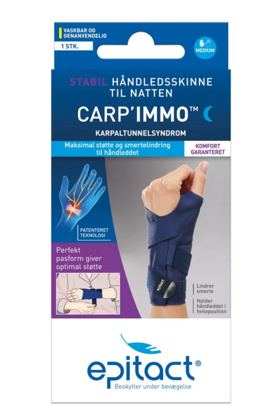 Den ultralette håndledsskinne tilpasser sig håndleddet perfekt og holder det i en neutral stilling ved hjælp af de halvstive integrerede komponenter.