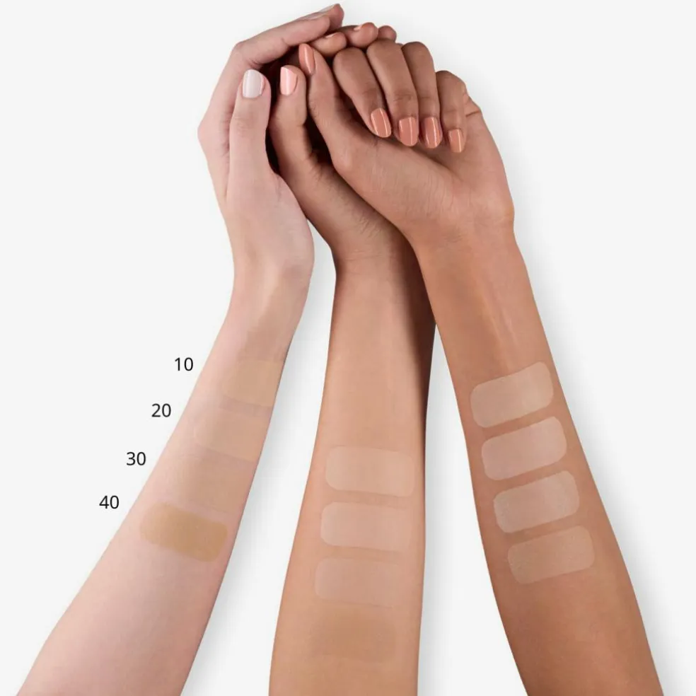 Den naturlige matte finish holder i op til 14 timer og er vandfast og vandfast. Formlen indeholder ikke silikone og mikroplastiske partikler, og strukturen udtørrer ikke huden og lægger sig ikke i fine linjer – perfekt til en mere jævn teint.