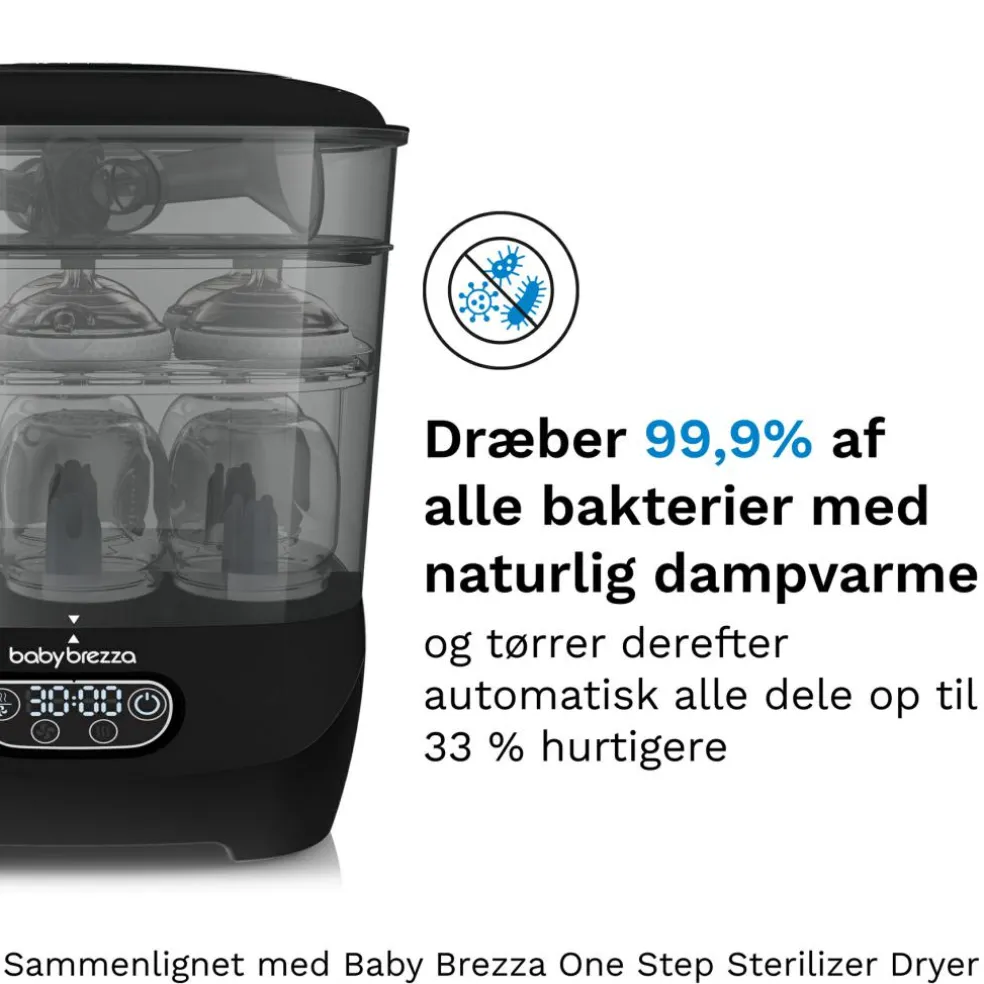– Steriliserer og tørrer automatisk flasker, brystpumpedele, sutter, bideringe, suttekopper, legetøj og andet tilbehør af alle mærker i ét nemt trin, så du sparer tid!