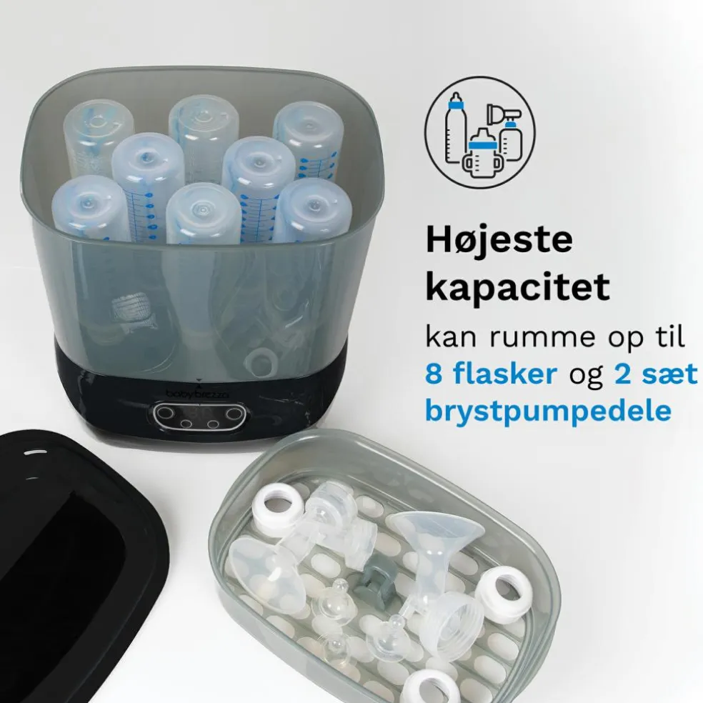 Den har den største kapacitet af alle sterilisatorer på markedet og kan rumme 8 flasker, 2 komplette brystpumpesæt, sutter og tilbehør fra alle mærker.