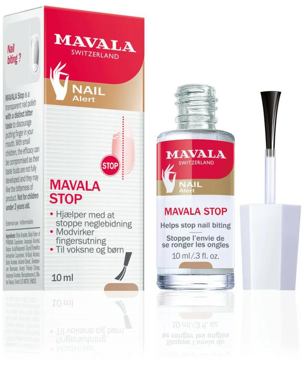 Hjælper med at stoppe vanen med at bide negle og sutte på fingre. Neglebidning er en skidt vane, som hurtigt kan accellerere og komme ud af kontrol. Mavala Stop har en udpræget bitter smag og ser ud som en klar neglelak. Den hjælper med at bryde vanen med at bide negle eller sutte på fingre. Kan bruges direkte på neglen eller oven på neglelak. Velegnet til børn over 3 år og voksne. Kan forvirre smagsløgene hos børn under 3 år, da deres smagsløg endnu ikke er fuldt udviklede og børnene derfor fejlagtigt kan synes godt om den bitre smag, så effekten udebliver. Anvendelse: Læg et lag Mavala Stop på hele neglens overflade (eller oven på neglelak) og lad det tørre. Undgå at vaske hænder lige efter påføring. Gentag hver anden dag ind til at vanen er stoppet. Inden hver ny påføring fjernes det gamle lag med neglelakfjerner. Vigtigt: ikke egnet til børn under 3 år.