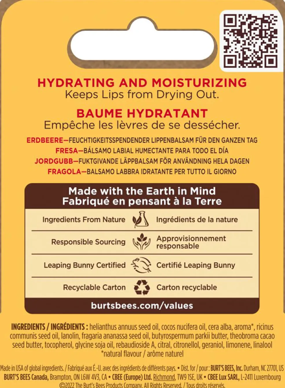 Burt’s Bees® læbepomader er 100 % naturlige. Denne natrulige læbepomade med jordbærsmag er beriget med Bivoks, Nærende Olier og Shea Butter, der sørger for at læberne får tilført næring og efterlades bløde og velplejet. Mat finish med en smag af jordbær.
