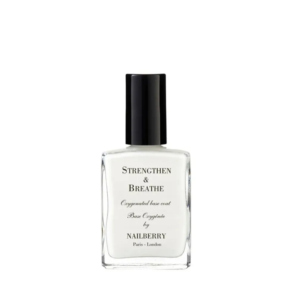 Boost kondition og styrke, mens du begrænser brud med Nailberrys dobbeltvirkende base coat og styrkende neglebehandling.