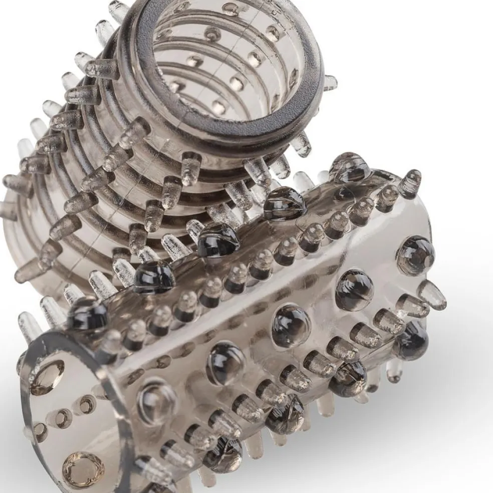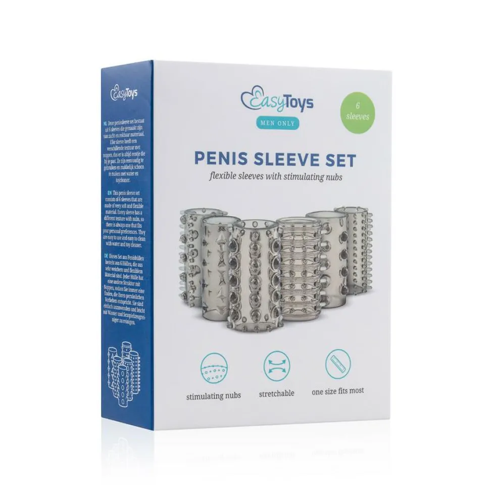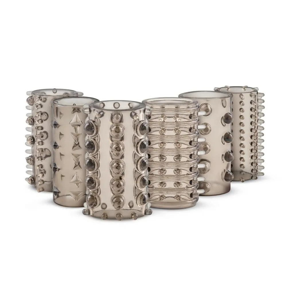 Du kan også sætte sleeves på dildoer, vibratorer eller andet legetøj for at få ekstra stimulation under penetration. Alle seks sleeves har en forskellig ydre struktur med ribber og nubre.