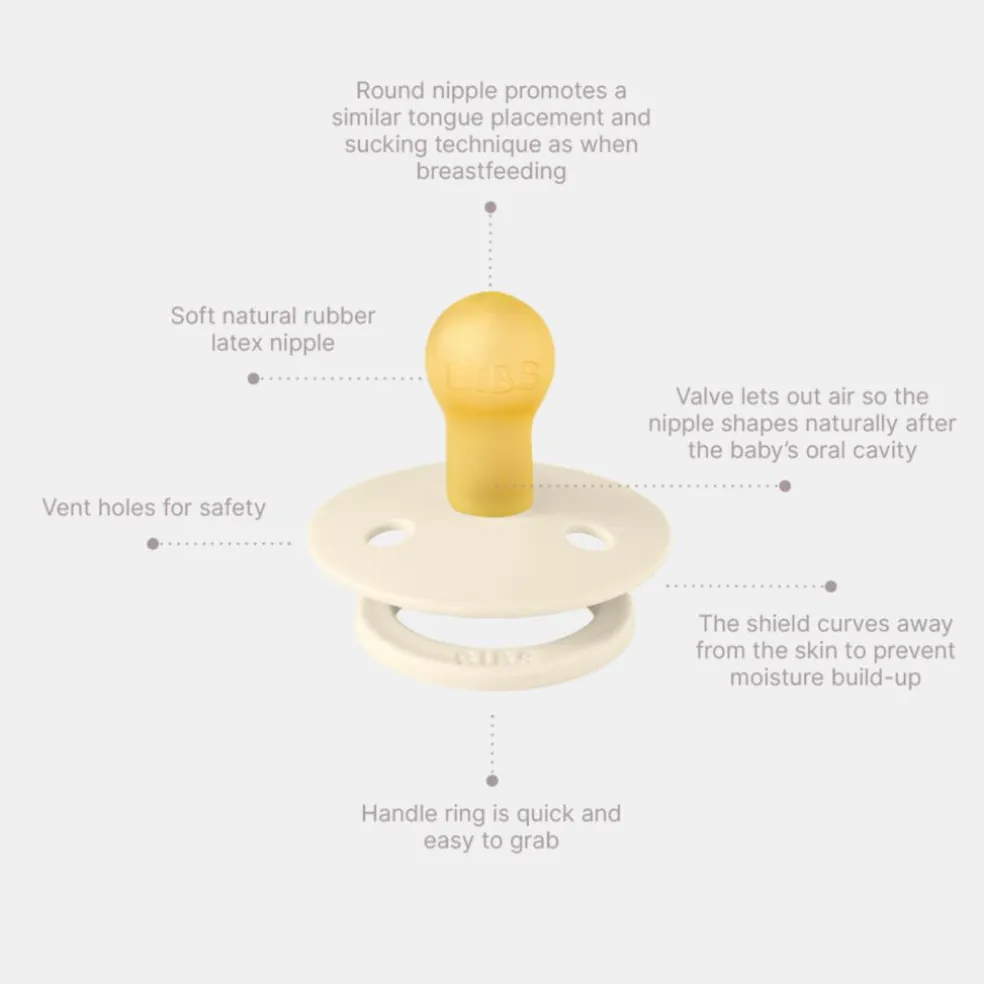Denne kollektion giver forældre mulighed for at dele deres unikke stil med deres barn uden at gå på kompromis med kvalitet og sikkerhed.BIBS Colour er den originale BIBS-sut og har været på markedet i over 40 år. Den har det karakteristiske runde BIBS-skjold med tre udluftningshuller og en rund BIBS-indgraveret ring.
