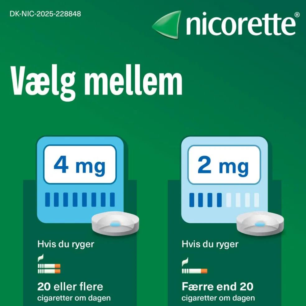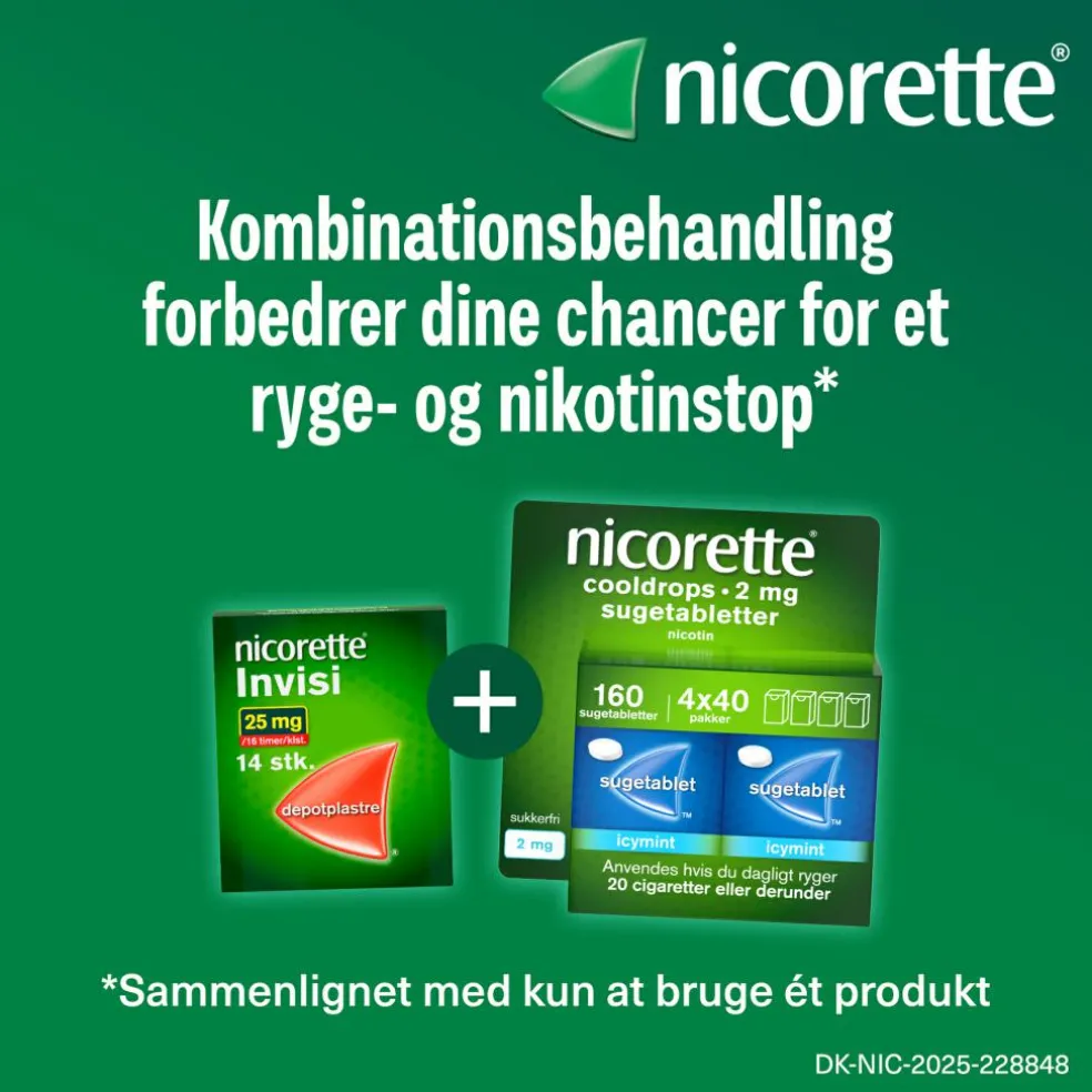 Nicorette Cooldrops & Fruit SugetabletterSugetablet (nicotin), 2 mg og 4 mg sugetabletter til behandling af tobaksafhængighed gennem lindring af nicotintrang og abstinenssymptomer og rygetrang. Anb. brug højst 9 måneder. Må ikke bruges ved overfølsomhed over for indholdsstofferne. Sukkersygepatienter bør være opmærksomme på, at en øget insulinoptagelse forekommer ved rygeafvænning. Nicorette Fruit indeholder en mindre mængde sulfitter, som i sjældne tilfælde medføre overfølsomhedsreaktioner og vejrtrækningsbesvær. Nicotindoser, som en voksen ryger tolererer, kan give forgiftningssymptomer eller være dødelig hos små børn. Bør ikke bruges af kvinder som ønsker at blive gravid, gravide/ammende og børn 12-18 år uden lægens anb. eller til børn u. 12 år og af personer der aldrig har røget. Risikoen bør dog afvejes over for fortsat rygning. Sugetabletter kan udgøre en kvælningsfare.Bivirkninger: Nældefeber, hævelse af ansigt, tunge eller svælg, vejrtrækningsbesvær, besvær med at synke, Kvalme, ømhed og irritation i mund/hals eller tunge, ændringer i smagssansen, kulde, varme, snurrende, prikkende fornemmelse i huden, træthed, opkastning, diarré, hovedpine, hoste, hikke. Dosering: Mange lægemidler kræver dosisjustering ved rygeophør. 2 mg: Bruges ved rygetrang hos rygere, der ryger 30 min. efter de er vågnet. 4 mg: Bruges ved rygetrang hos rygere, der ryger > 20 cig. dgl eller dagens 1. cigaret <30 min. efter de er vågnet. Normalt anvendes 8-12 sugetabl. per dag, dog ikke flere end 15. Øjeblikkeligt rygeophør: 6 ugers behandling fulgt af nedtrapning. Gradvist rygeophør: Behandling og gradvis reduktion af rygning i højst 6 måneder fulgt af øjeblikkeligt rygeophør med behandling og nedtrapning. Sugeteknik: Sugetabletten flyttes løbende fra én side af munden til den anden, hvilket gentages, indtil den er helt opløst. Må ikke tygges eller synkes og mad og drikke må ikke indtages, mens sugetabletten er i munden.Pakninger: 2 mg: 20, 80 og 160 stk., 4 mg: 80 stk. Læs indlægssedlen for yderligere oplysninger. McNeil Denmark ApS, tlf. 00 800 855 000 00, www.nicorette.dk. Medicinske produktspørgsmål kan rettes til vores medicinske informationsafdeling: www.kenvuecontact.eu Marts 2024.