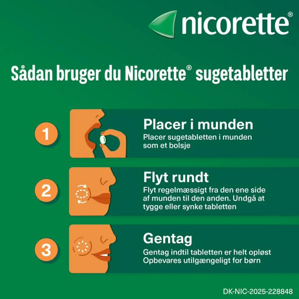 Brugsanvisning: Denne medicin er til brug i mundhulen og skal placeres i munden, hvor den lidt efter lidt opløses og frigiver nicotin, så det optages i kroppen via mundens slimhinde.
