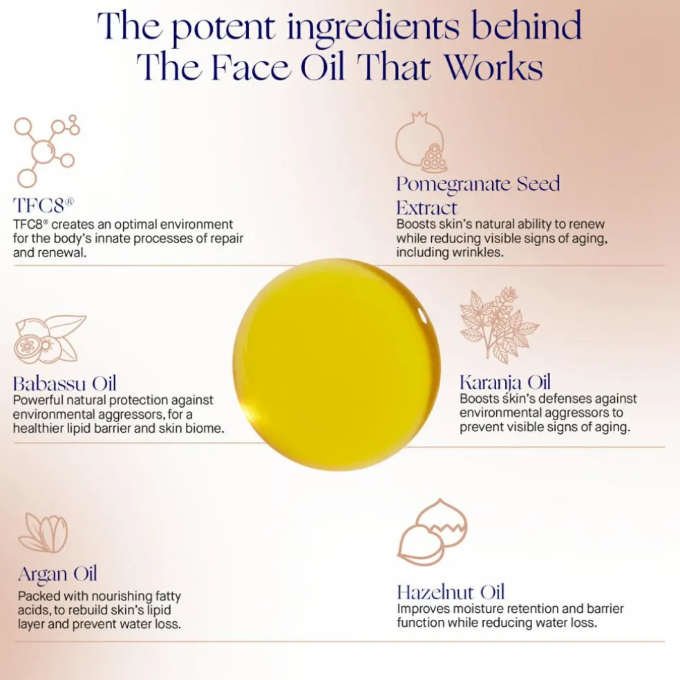 Den er baseret på vores egenudviklede TFC8®, et kompleks af naturlige aminosyrer, højkvalitetsvitaminer og syntetiske molekyler, der forbedrer hudens naturlige reparationsprocesser, samt en luksuriøs blanding af aminosyrerige olier, herunder plejende babassu, fugtgivende argan, nærende hasselnød og antimikrobiel karanja, der fremmer en fastere, glattere og sundere hud.