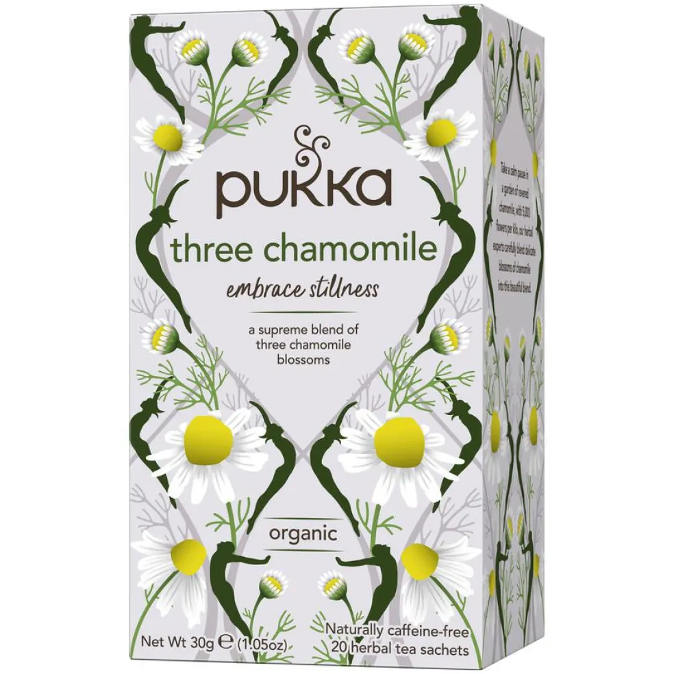 Pukka Three Chamomile er en perfekt kombination af 3 slags økologisk kamille: Egyptisk, kroatisk og ungarsk.