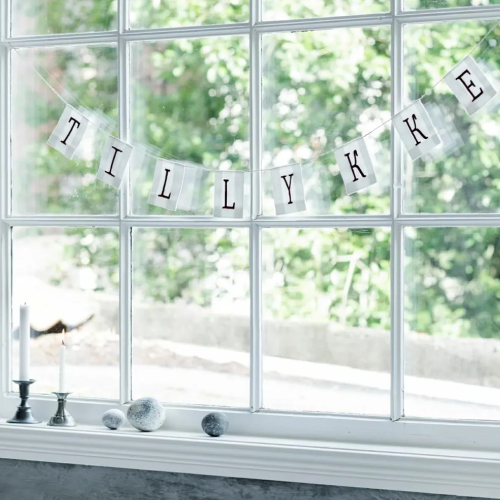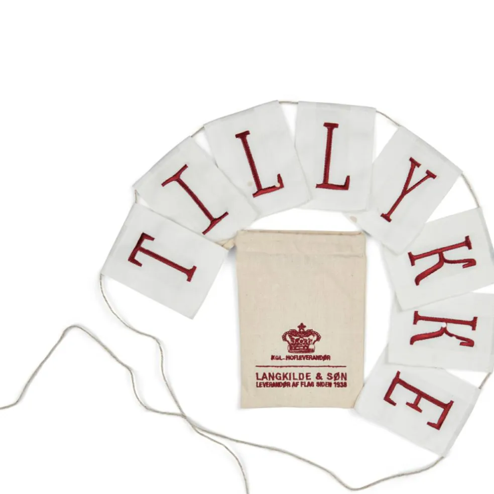 Meget smuk og elegant ranke med 8 hvide flag syet i vores originale flagdug, broderet med rød tråd og sat på sejlmagergarn lige til at hænge op og bruge år efter år. Brug flagranken til fødselsdage, bryllupsdage, konfirmationer og andre festlige lejligheder.