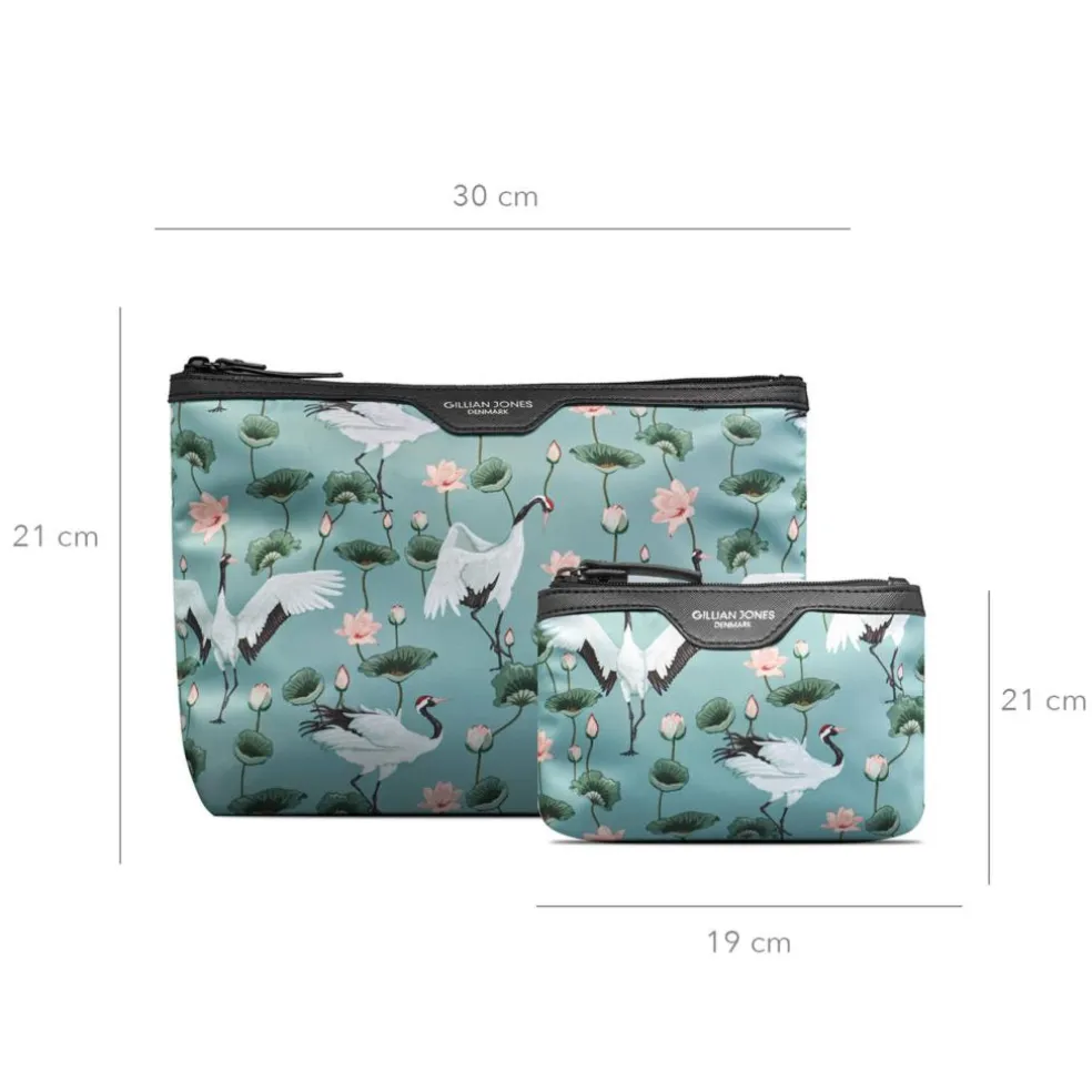 Sæt med toilettaske og makeup pung, fra Urban Travel linjen der er designet og produceret med så lidt co2 aftryk som muligt. Både toilettasken og makeup pungen udvider sig efter hvor meget du putter i, designet er stramt og leveres uden unødvendig udstopning. Materialet af genanvendt nylon med en fast kant i PU der gør at kosmetik tasken holder faconen. Kan maskinvaskes ved 30 g.Inden i toilettasken er der en lynlås lomme samt 2 net lommer. Der er mange anvendelse måder; Hold styr på din mobiltelefon incl headset, opbevar dine solbriller sammen med kreditkort, og selvfølgelig til din uundværlige make up og pleje midler. Kan maskinvaskes ved 30 grader, og lave omdrejninger, og tørres ved lav varme. Alle toilettaske-sæt fra Gillian Jones Urban linjen fås i mange forskellige farver og prints.
