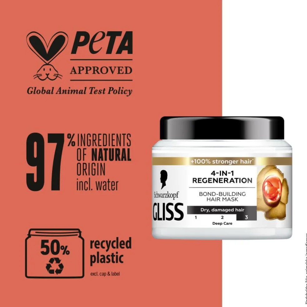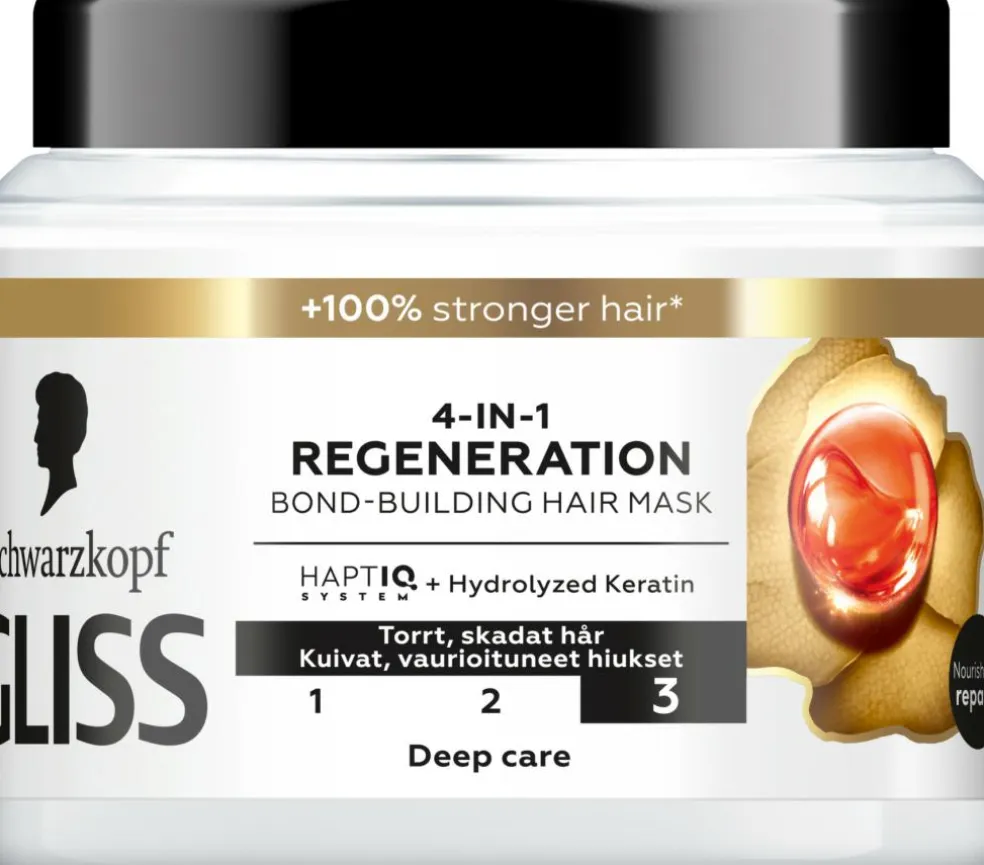 Gliss Care Level: 3 – Pleje i dybden med formler til at genopbygge håret i dybden med højtydende ingredienser. Denne Gliss hair treatment med HAPTIQ-system danner mikrobindinger og styrker hårets struktur. For et smukt resultat, du kan se og føle. Med en beskyttende moskusagtig duft. 97 % af ingredienserne er af naturlig oprindelse.*