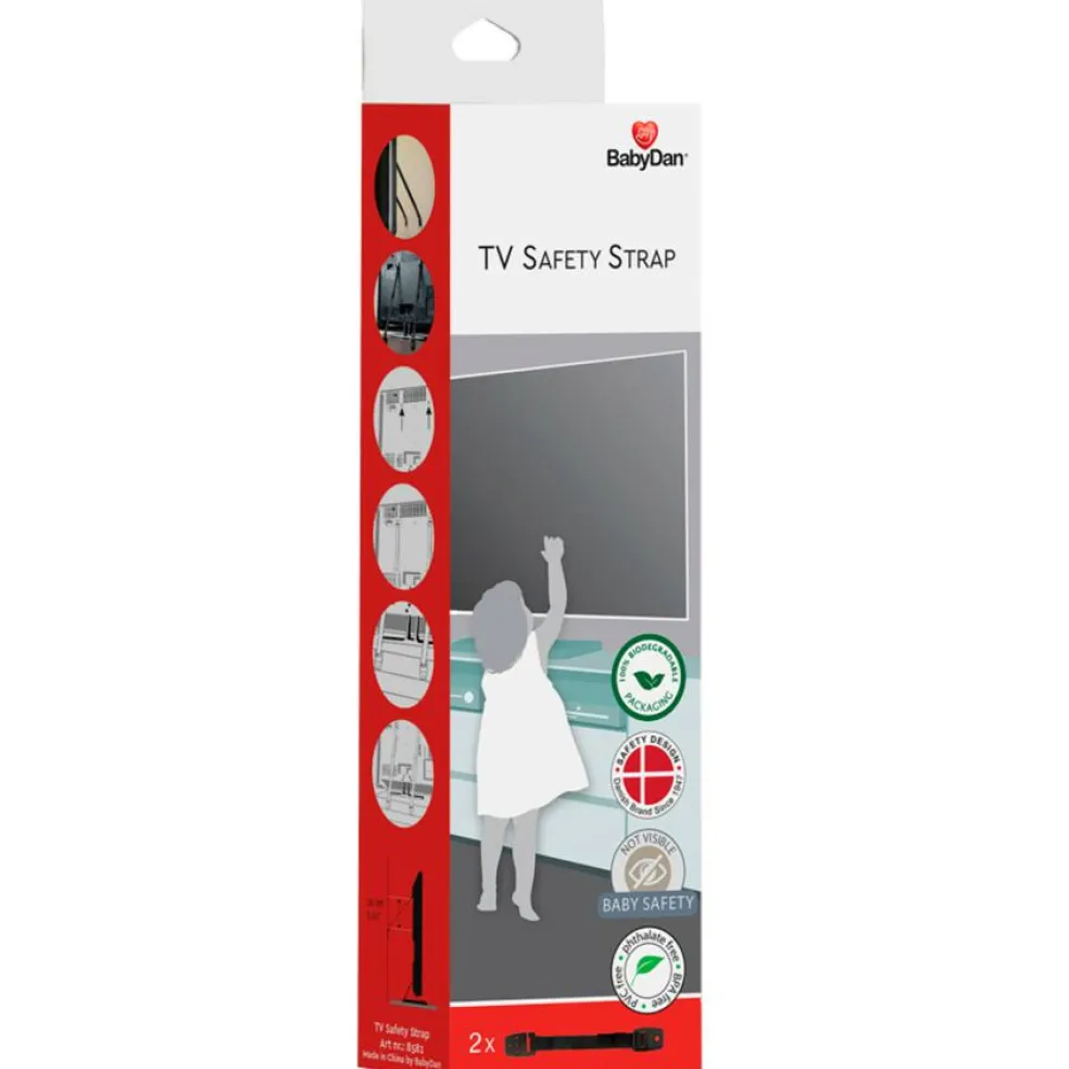 Med vores TV Safety Strap sikrer du, at dit fjernsyn ikke tipper, mens dit barn leger i stuen. Stropperne er monteret på fjernsynet og på møbler eller væg med skruer. Skruerne til fjernsynet er inkluderet i pakken. Vær opmærksom på at vælge de rigtige skruer ift. det materiale, de skal skrues i.