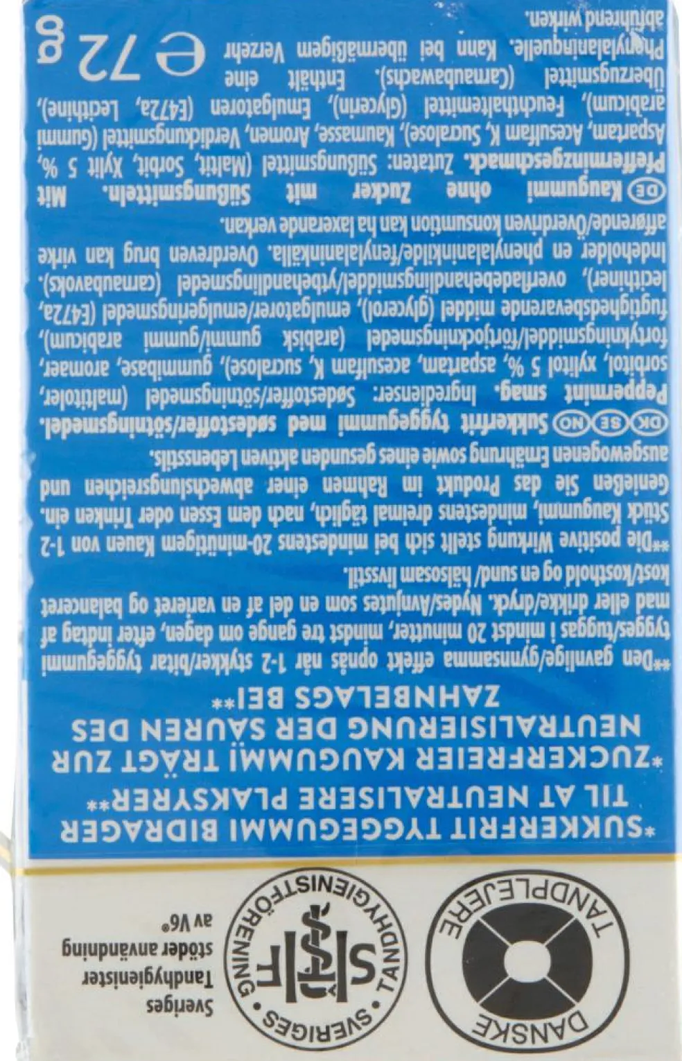 Sukkerfrit tyggegummi bidrager til at neutralisere plaksyrer. Den gavnlige effekt opnås, når 1-2 stykker tyggegummi tygges i mindst 20 minutter, mindst 3 gange om dagen, efter indtag af mad eller drikke.