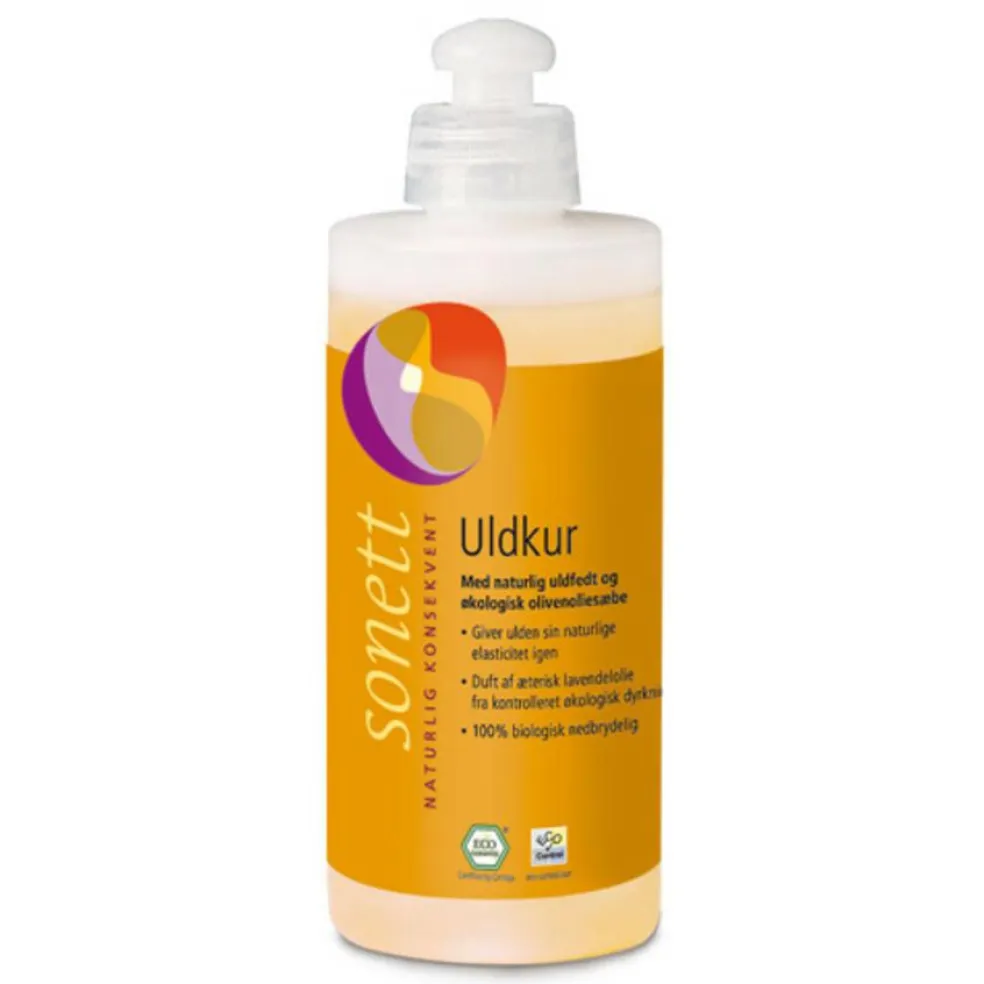 Sonett uldkur gør uldtekstilerne bløde igen og tilfører bl.a. blebukser det nødvendige fedtindhold, så de bibeholder den gode sugeevne. Ved vask mistes det naturlige fedtindhold i ulden. Sonett Uldkur tilfører igen ved regelmæssig brug det nødvendige uldfedt og giver ulden sin naturlige elasticitet igen. Duft af æterisk lavendelolie.