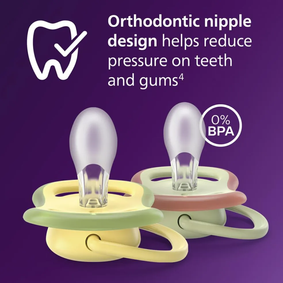 Sutten er fremstillet af 100 % silikone af medicinsk kvalitet, er slidstærk og BPA-fri. Den er supernem at rengøre og modstandsdygtig over for høje temperaturer, så den kan steriliseres effektivt. Med selvlysende funktion, så du undgår at vække den lille, når sutten spyttes ud eller tabes.