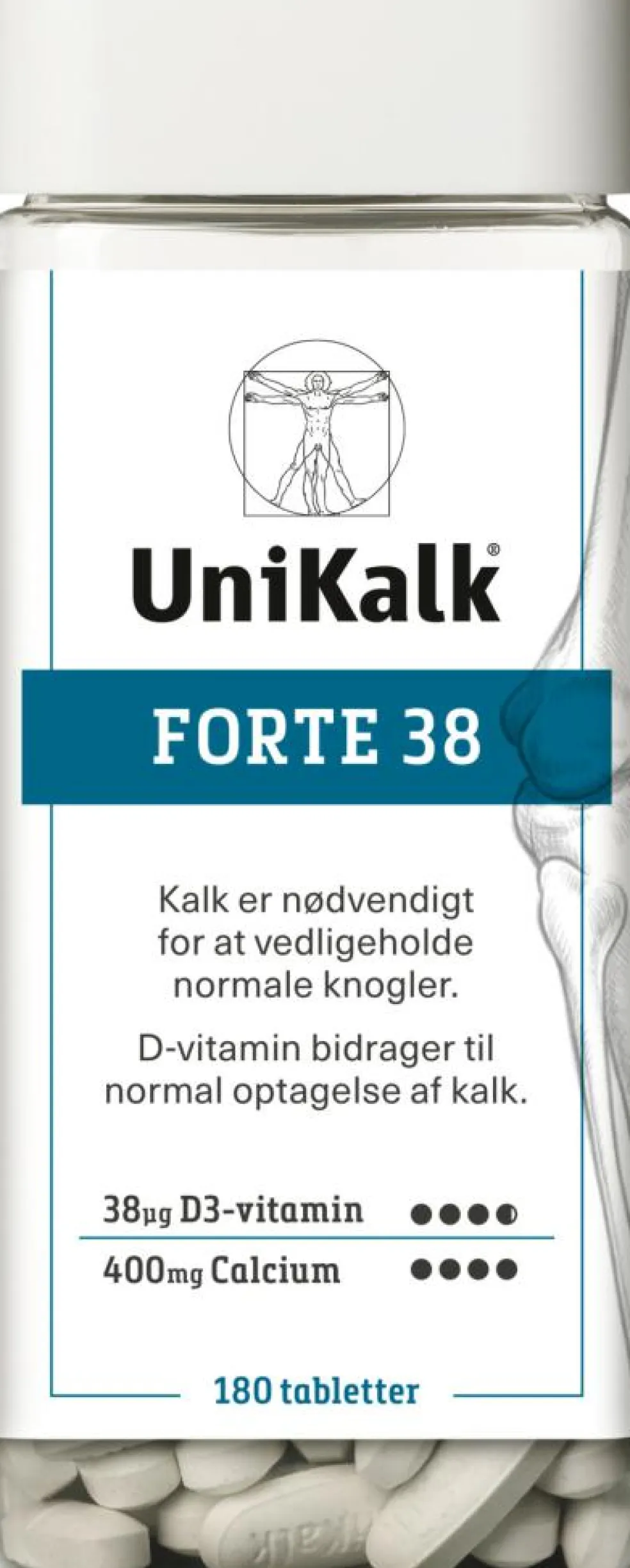 UniKalk Forte 38 er et kosttilskud, der indeholder kalk (calcium) og D-vitamin. Kalk er nødvendigt for at bevare normale knogler. D-vitamin bidrager til at vedligeholde normale knogler og bidrager desuden til et normalt calciumindhold i blodet og en normal optagelse og udnyttelse af calcium.