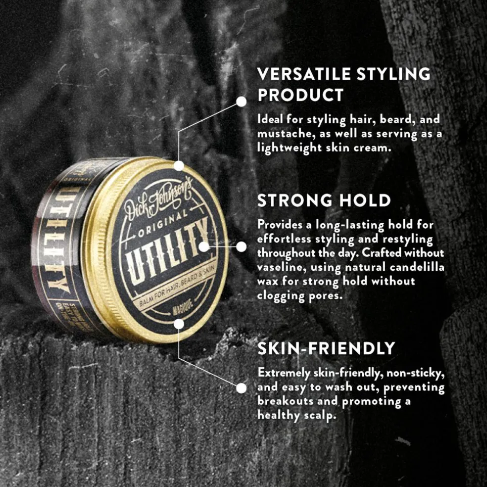 Dick Johnson’s Utility Balm er velegnet til styling af hår, skæg og overskæg samt som hudcreme, tro det eller ej. Det, der adskiller Dick Johnson’s Pomade fra de andre, er, at det er lykkedes os at lave en oliebaseret pomade uden vaseline. Vi erstattede det med candelillavoks, som er en naturlig plantebaseret voks. Sammen med vores kemikere har vi brugt det meste af to år på at udvikle et naturligt hårfedt, der har et ordentligt hold og nemt kan restyles. Vores Utility Balm er ekstremt hudvenlig, den er ikke klistret og den er nem at vaske. Vi sprøjtede en dejlig mængde Dick Johnson signaturduft kaldet “”Whisky & Vanilla”” i, så med produktet får du den ægte Dick Johnson-oplevelse! Fordi der ikke er brugt vaselin i produktet, tilstopper det ikke porerne. For at sige det enkelt: du får ikke bumser, og din hovedbund bliver godt! Sådan bruges: Spred en mængde produkt på størrelse med en kno jævnt på begge håndflader og spred gennem hår, skæg eller overskæg. – Til hår, skæg og hud – Meget stærkt greb og omformaterbart – Vaskes nemt af – Naturlig, vegansk og vaselinefri