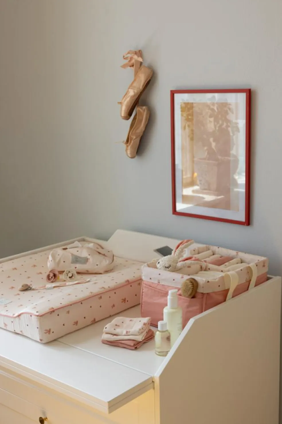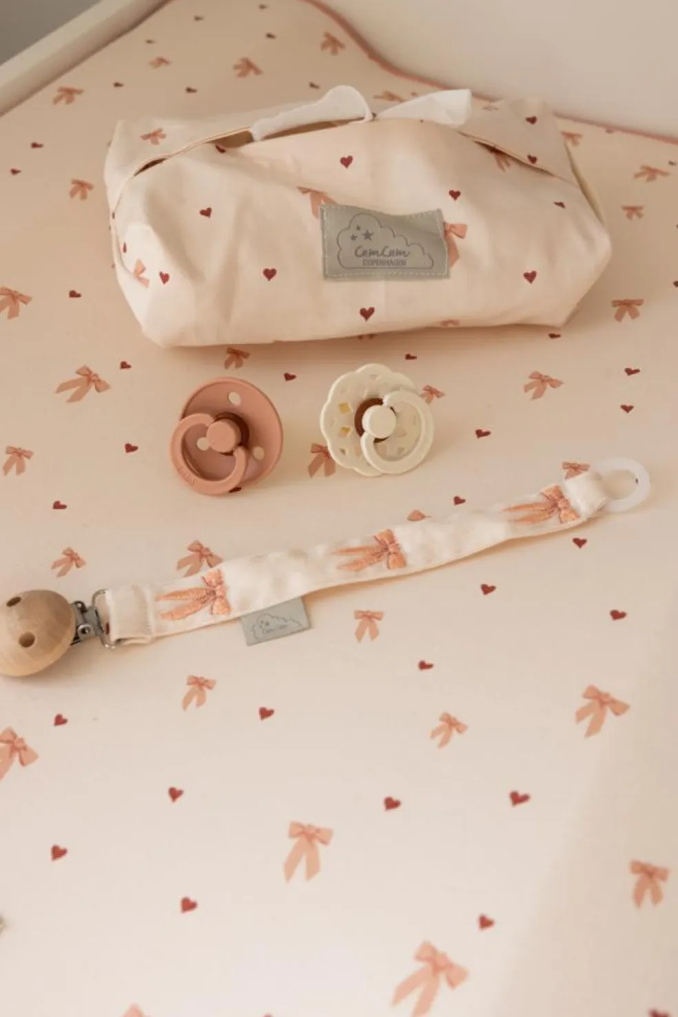 Etuiet matcher de fleste standardpakker med vådservietter, og vil pynte på puslebordet eller i pusletasken. Det har en praktisk bærestrop i canvas på siden.