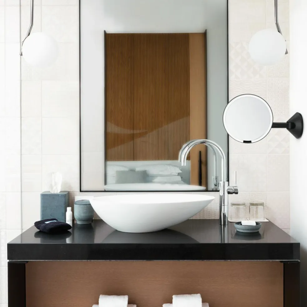 Spejlet er monteret på en robust teleskoparm i rustfrit stål, der giver en jævn og let justerbar bevægelse. Du kan trække det frem, justere vinklen og skubbe det tilbage, når du ikke bruger det – altid med en flydende og elegant bevægelse.
