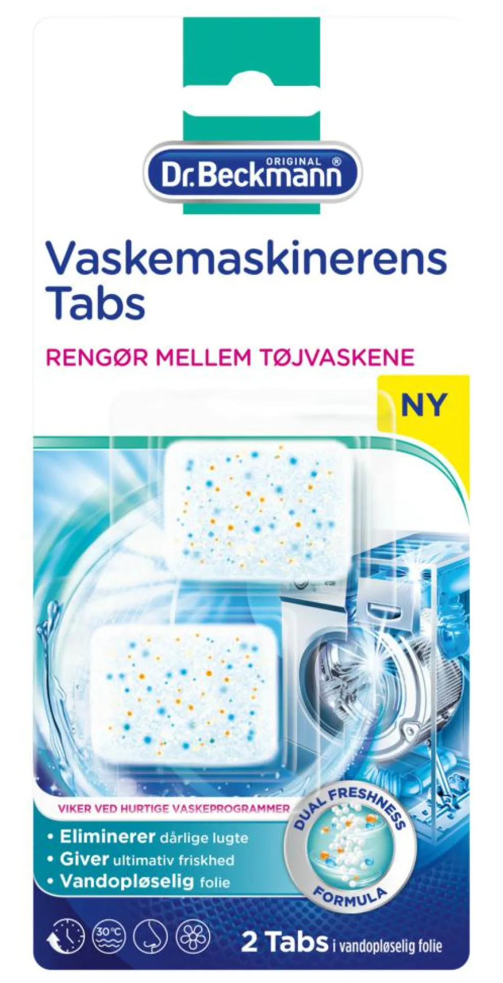 Maskinrens, som effektivt rengør vaskemaskinen og hjælper med at fjerne uønsket lugt. Den kraftfulde rens rengør indefra og sørger for at svært tilgængelige områder bliver rengjort i dybden. Pakken indeholder to vandopløselige tabs, der bruges mellem tøjvaskene og virker selv ved korte vaskeprogrammer.