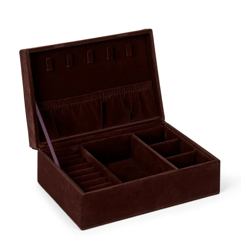Skrinet har flere adskilte rum og en sektion i låget til halskæder.