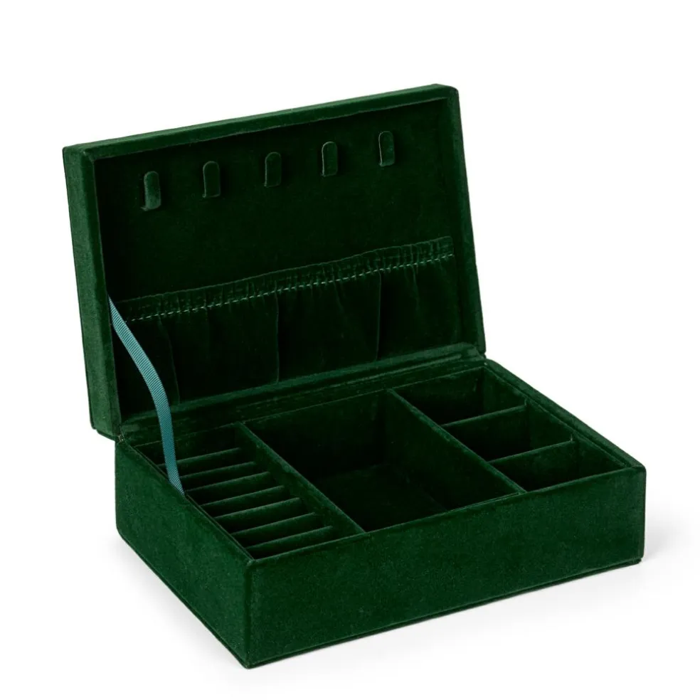 Skrinet har flere adskilte rum og en sektion i låget til halskæder.