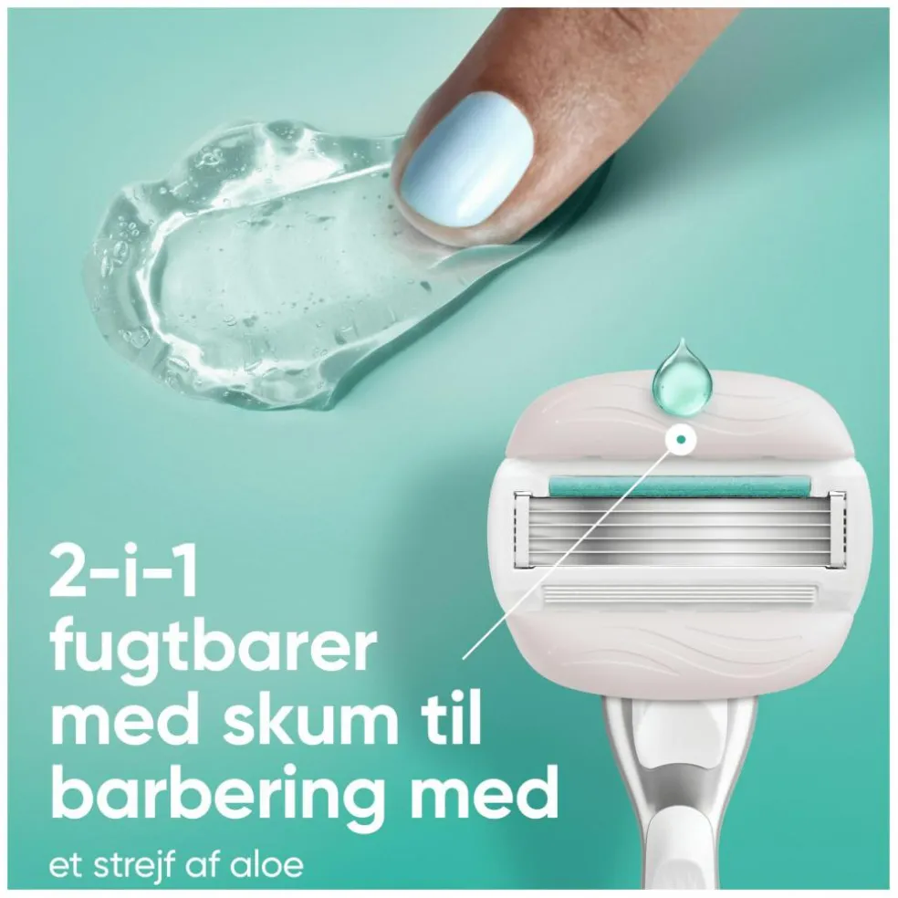 SkinCushion-smørestrimlen med et strejf af aloe hjælper med at beskytte huden mod irritation fra barbering. Barberbladene med 5 blade glider hen over huden og hjælper med at beskytte mod tør hud efter barbering.