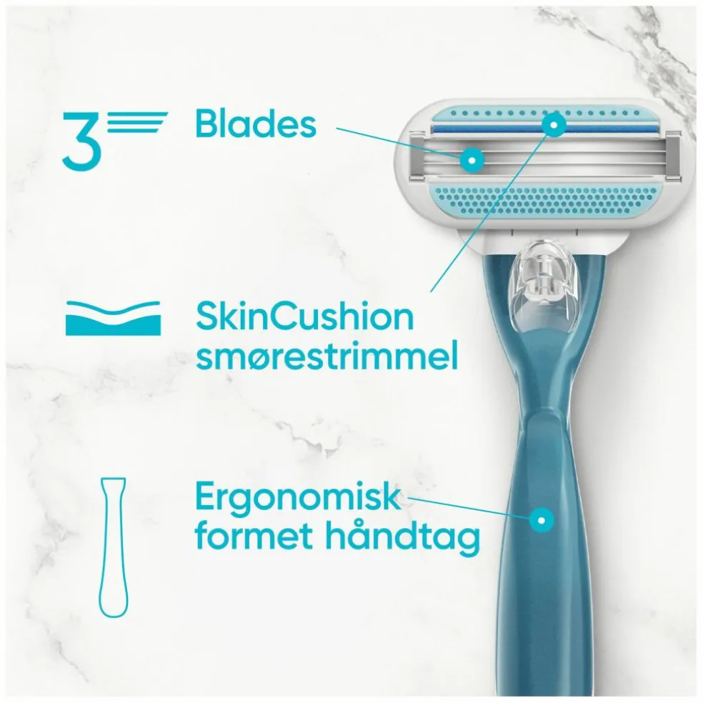 Vores SkinCushion-smørestrimmel (og SkinElixir med et strejf af aloe) hjælper med at beskytte din hud mod irritation. Og hvis du mangler flere måder at give din hud den kærlighed, den fortjener, se hele udvalget af Venus-produkter, fra barberskrabere til barbergeler, engangsskrabere til ansigtsskrabere og meget mere.