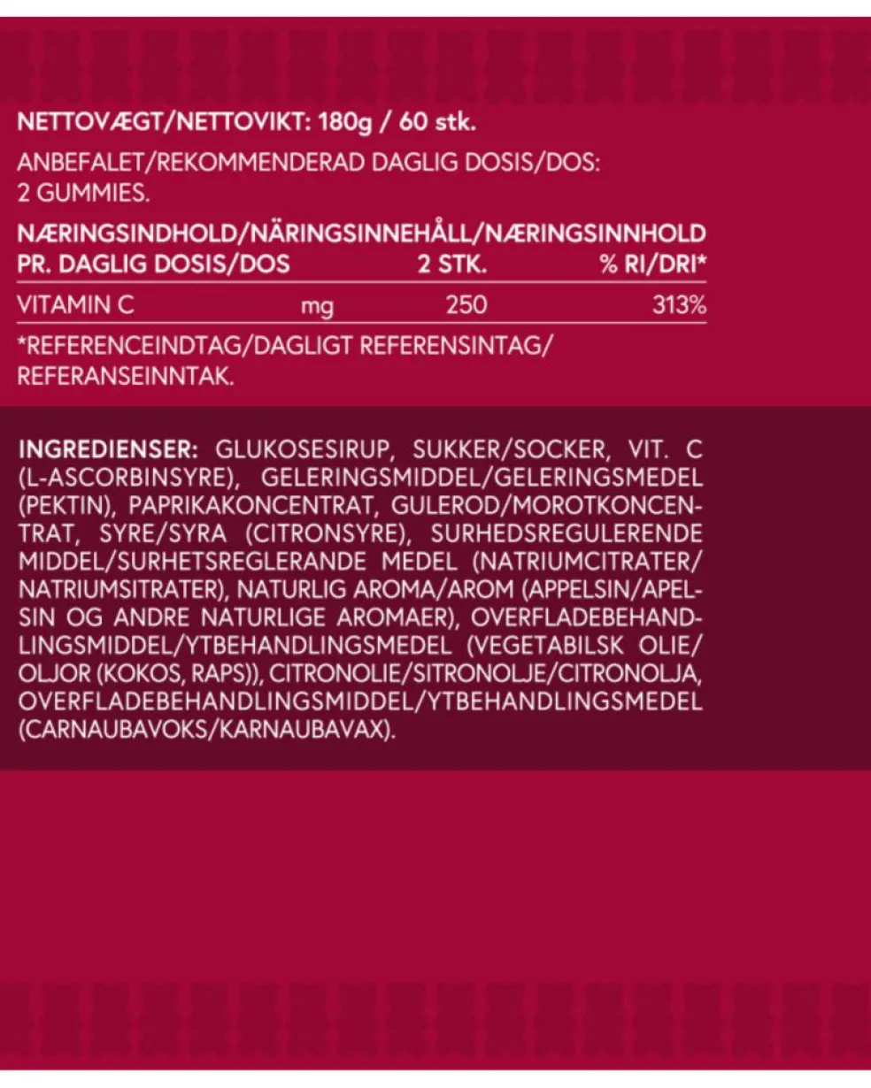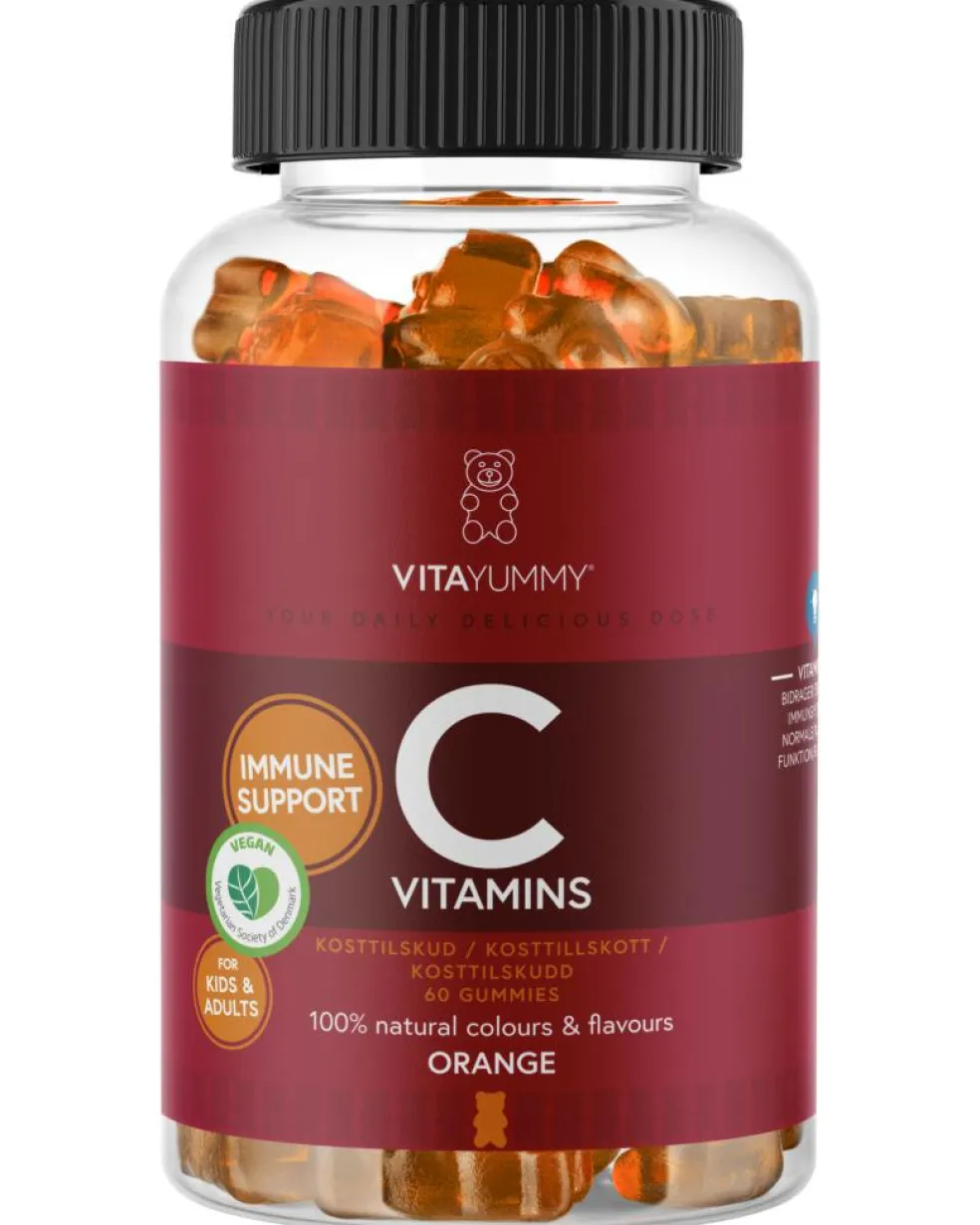 Vitamin C bidrager blandt andet til: -Immunsystemets normale funktion -At mindske træthed og udmattelse -en normal psykologisk funktion -et normalt energistofskifte -nervesystemets normale funktion VitaYummy Vitamin C har en lækker appelsin smag, og den flotte naturlige farve kommer fra paprika og gulerod. VitaYummy Vitamin C er vegansk og fri for kunstige søde-, farve-, smagsstoffer.