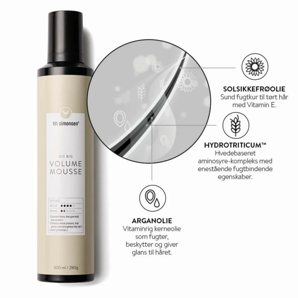 HH Simonsen Volume Mousse er udviklet til at give enhver hårtype et øjeblikkeligt løft, samtidig med at håret bevarer sin naturlige lethed og bevægelighed.