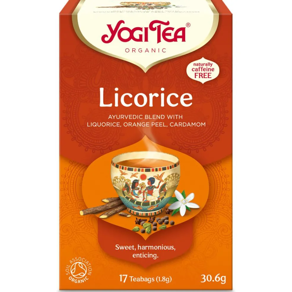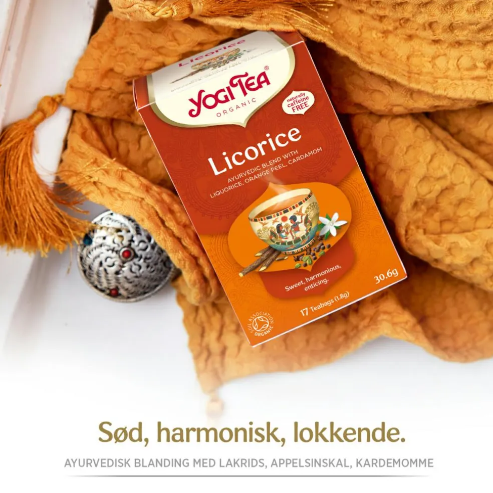 Licorice teen er en blanding af lakrids, kanel, ingefær, appelsinskal og andre traditionelle Yogi Tea krydderier.